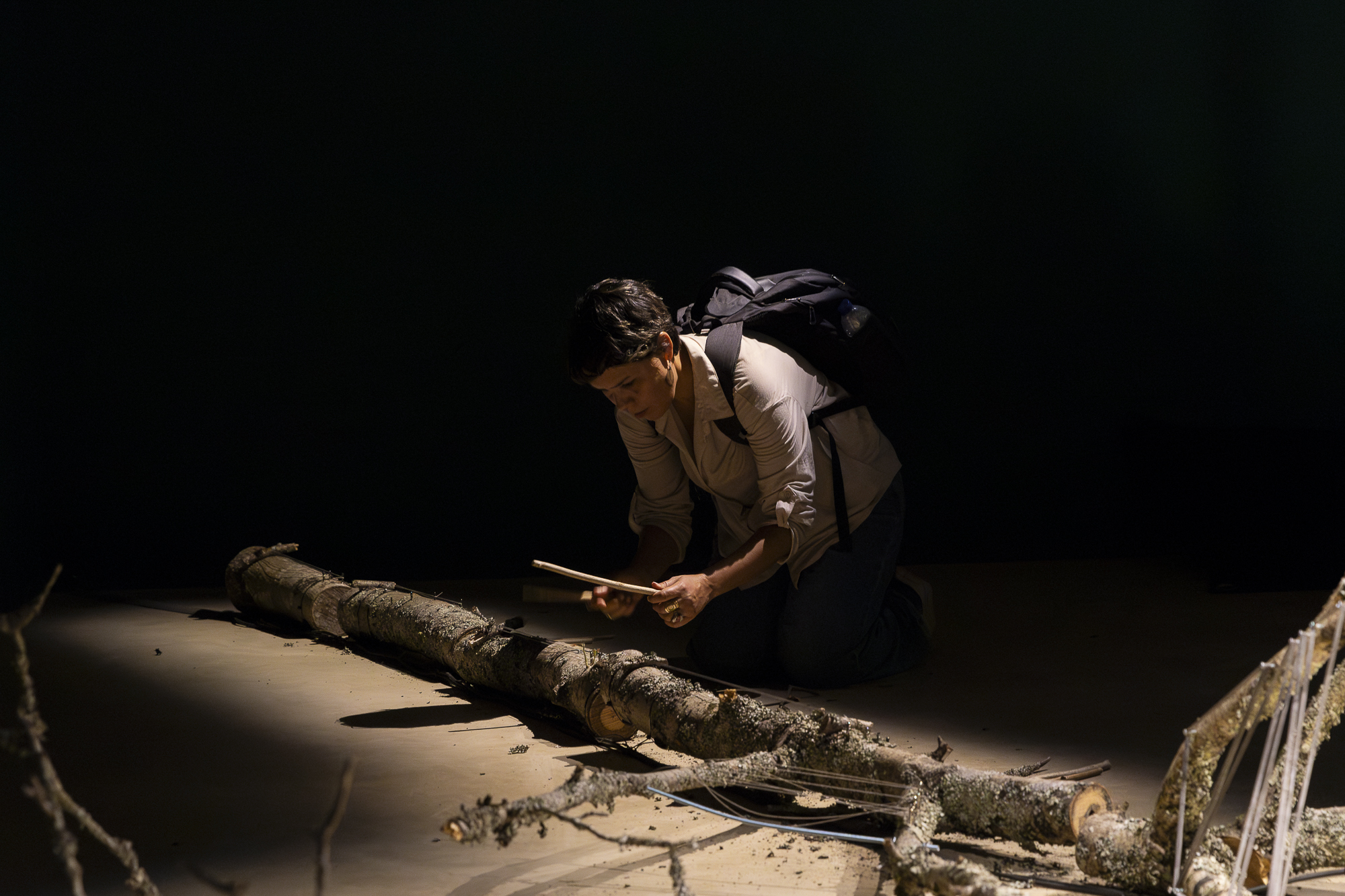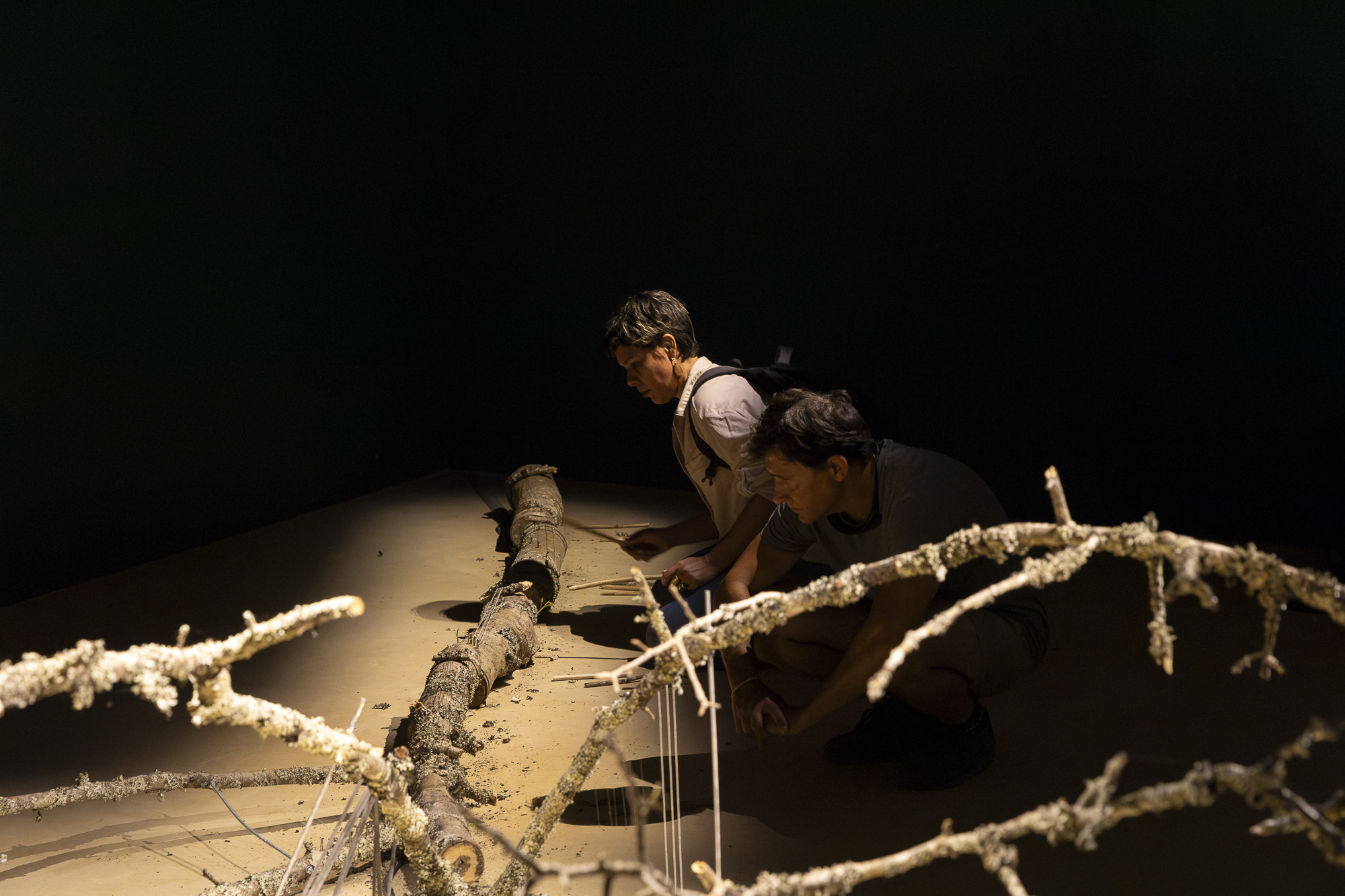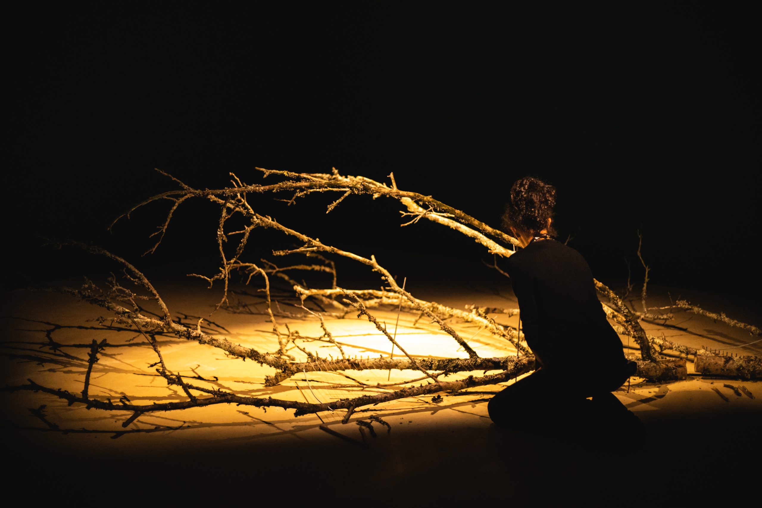 CORPO | uma topografia sonora (BODY | a sound topography) is an installation that crosses and combines different materials and sounds from the animal, plant and mineral worlds to create sound sculptures that are played by the audience. Developed from natural materials retrieved from Serralves Park, the installation functions as a whole, albeit divided into three distinct parts, each representing a scenic space in which the spectator is the protagonist. Some elements only truly manifest themselves through the spectator’s actions. “I know, words have other meanings, but when I say body, I mean the cosmos” Alberto Carneiro BODY | a sound topography is above all a work of listening. Before it manifested itself as a movement and creation, it knew how to be a conversation with the gardeners and other staff members of Serralves Park. Over the course of several artistic residencies in the Park, materials from cuttings and prunings were chosen in order to create the installation’s objects, sounds and images — ranging from the concrete to the dreamlike and symbolic. “There is no opposition between the living and the non-living. Every living being is not only in continuity with the non-living, but it is its extension, its metamorphosis, its most extreme expression. Life is always the reincarnation of the non-living, the bricolage of the mineral, the carnival of the planet’s telluric substance.” in Metamorphoses, by Emanuele Coccia BODY | a sound topography is about how the atoms in our bodies derive from distant stars, and from the bodies of extinct animals and unknown plants. We are made of the earth that we call a planet. Our bodies will be part of other existences that haven’t yet emerged, but are already part of our own. “BODY” is a poetic game that renders matter audible and vibration visible. Trees with a woman’s voice, roots with a heartbeat, branches that whisper words in our ears.