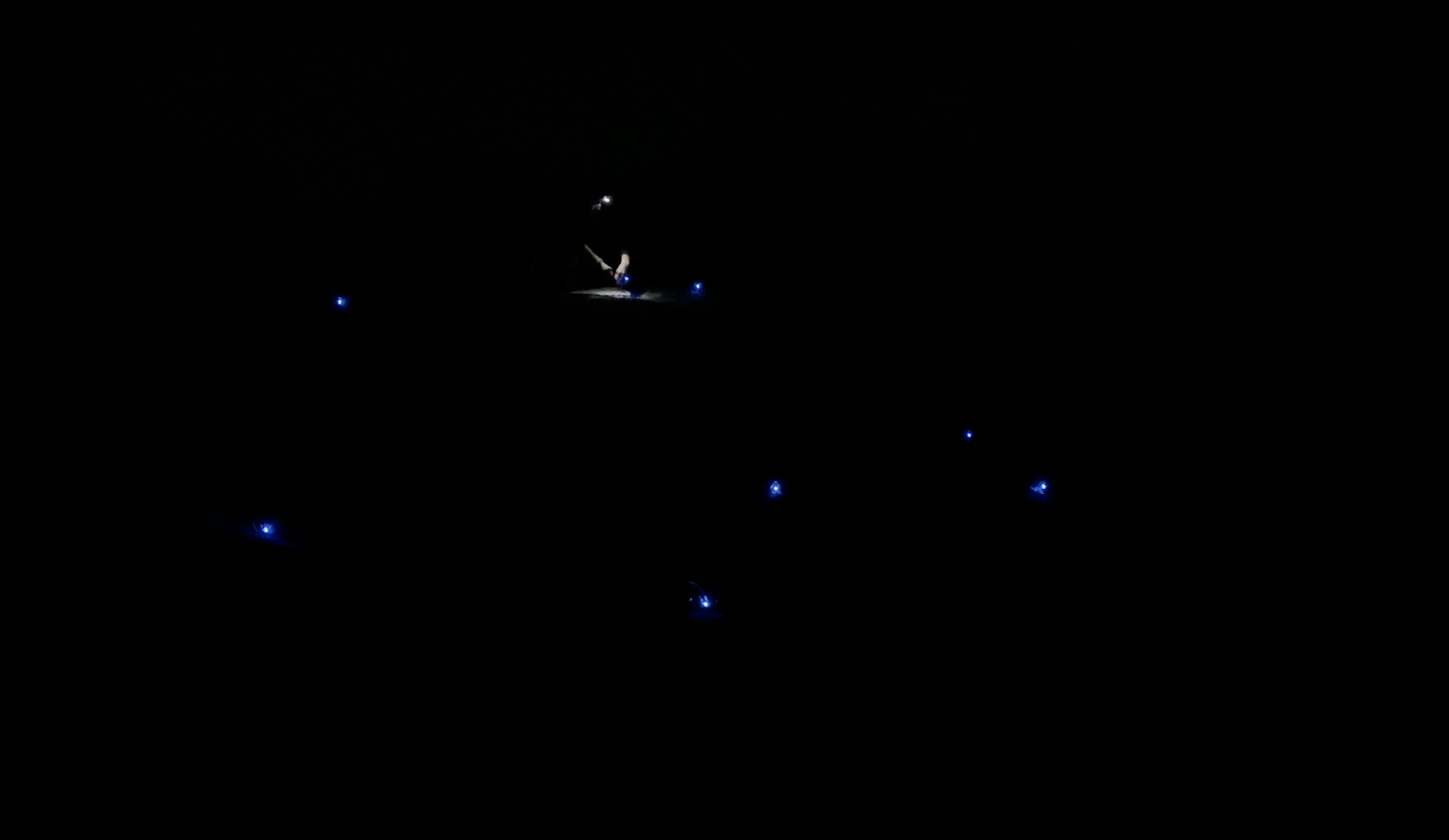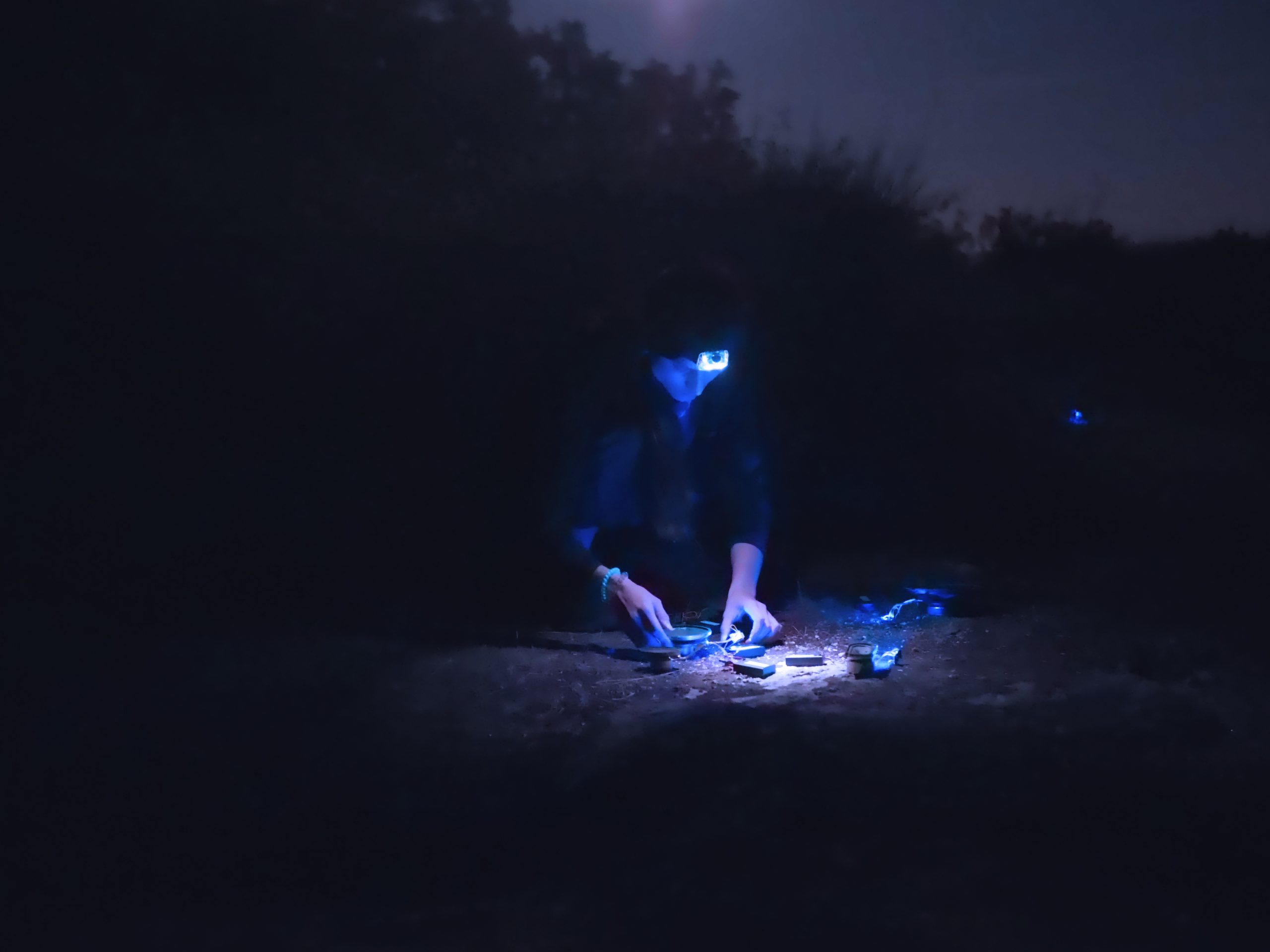 A recorded voice reads a science fiction report describing a mineral planet that could, in reality, be Earth. Then, moving through the darkness on the surrounding hills and plateaus, the artist lights up and deploys, step by step, the sound devices, each adorned with a small LED.