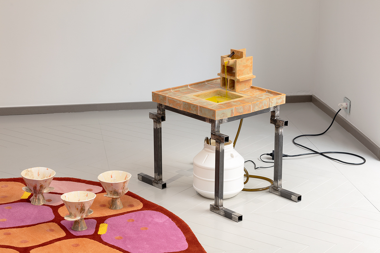 Save-haven values, hygiene and self-promotion infuse each of the domestic cells of the Oracular Workout exhibition, presented by Célia Picard and Hannes Schreckensberger. Between mystical aspirations and sporting discipline, the exhibition space of Mécènes du Sud Montpellier-Sète is transformed into a “show apartment” furnished with gymnastic apparatus, draperies and appliances, vectors of a quest that is both personal and societal.